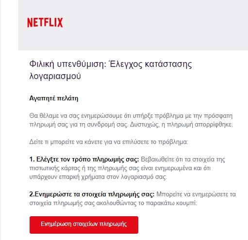 Σε email αναγνώστη του newshub.gr, ο οποιος προφανώς δεν είναι ο μοναδικός που έχει δεχτεί το συγκεκριμένο μήνυμα, οι επιτήδειοι ενημερώνουν πως η πληρωμή του λογαριασμού του στο Netflix απέτυχε. Για αυτό και θα πρέπει να προχωρήσει σε ενημέρωση των στοιχείων πληρωμής, προκειμένου - υποτίθεται - η πληρωμή να γινει εκ νέου.