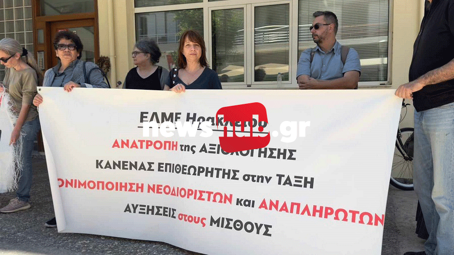 Οι διαμαρτυρόμενοι εκπαιδευτικοί συγκεντρώθηκε έξω από τα γραφεία της Περιφερειακης Διεύθυνσης Εκπαίδευσης Κρήτης.