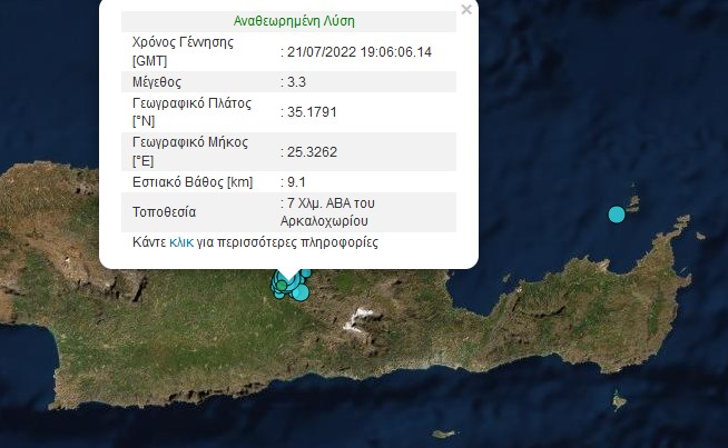 Λίγα λεπτά μετά τις 10 το βράδυ το Αρκαλοχώρι και οι γύρω περιοχές ταρακουνήθηκαν από σεισμική δόνηση που μετρήθηκε στα 3,3 ρίχτερ. Το επίκεντρο ήταν στα 7 χιλιόμετρα Ανατολικά-Βορειανατολικά του Αρκαλοχωρίου, ενώ το εστιακό βάθος ήταν στα 9,1 χιλιόμετρα.