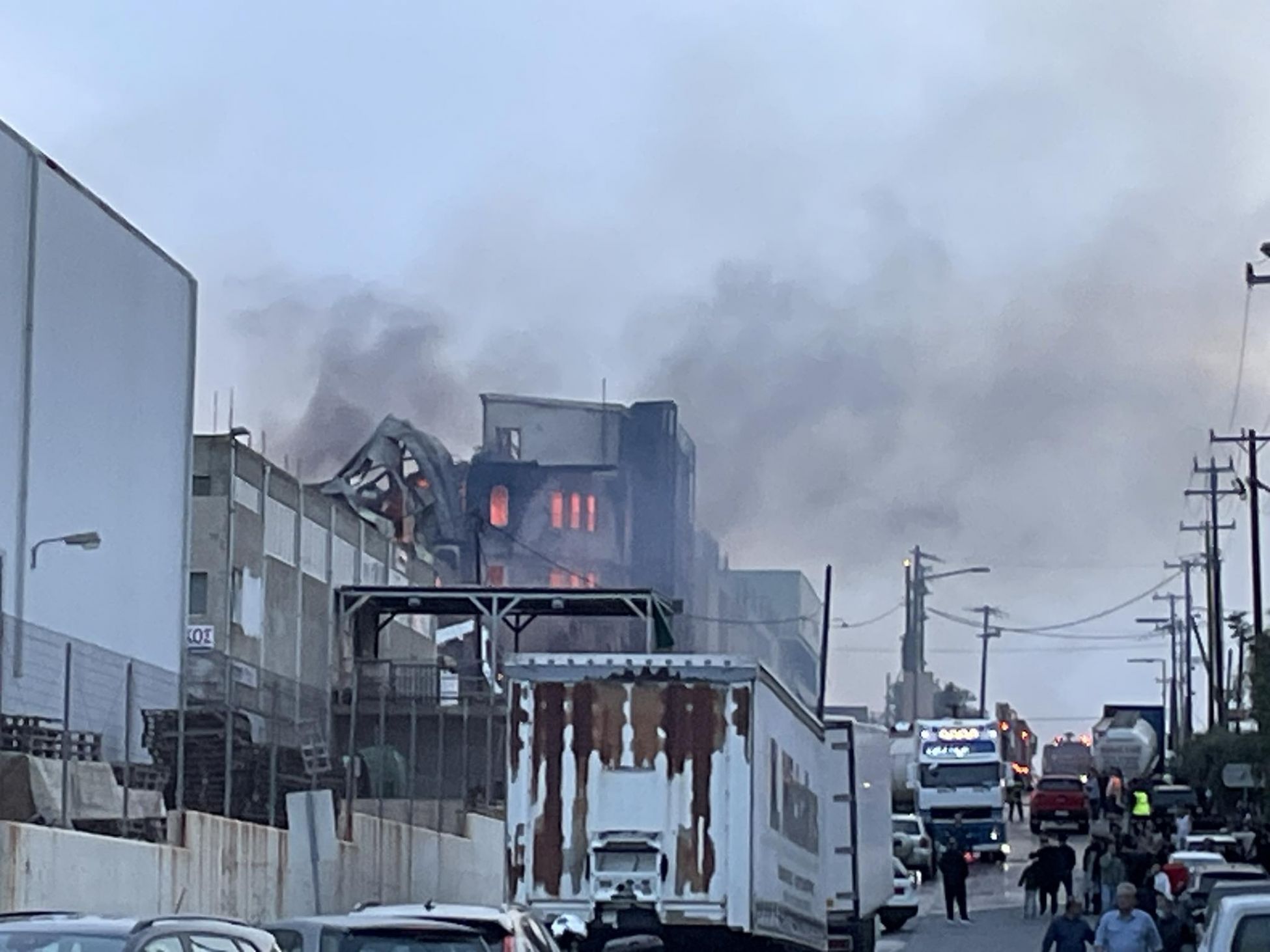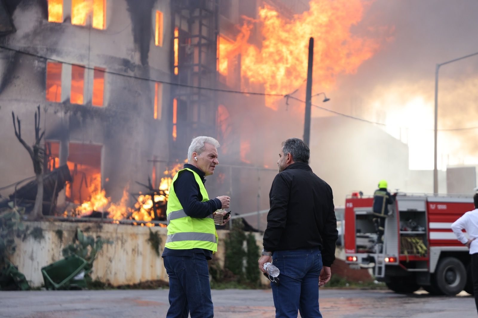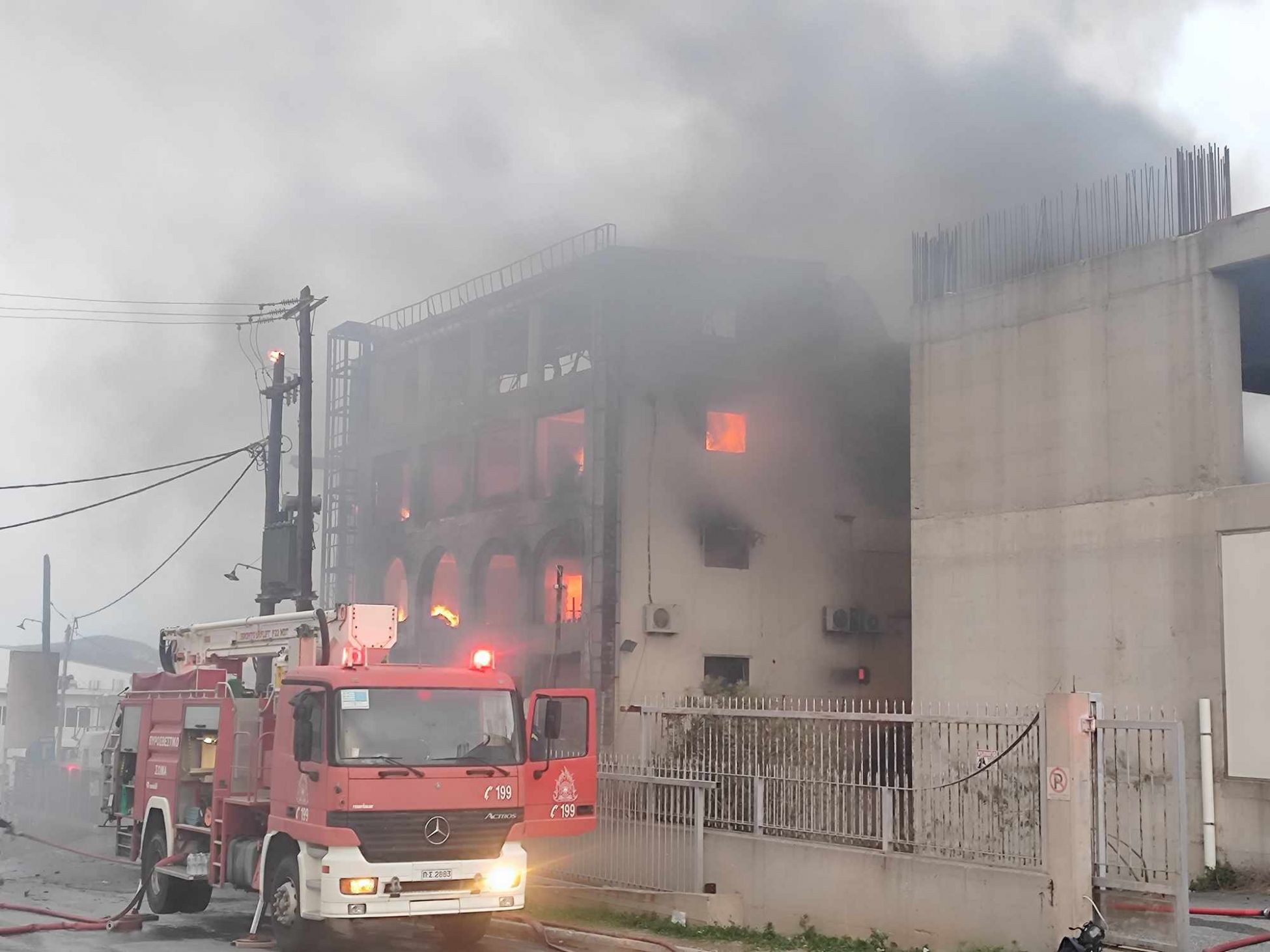 Η πυροσβεστική υπηρεσία καταβρέχει τα διπλανά εργοστάσια προκειμένου να μην επεκταθεί η φωτιά.