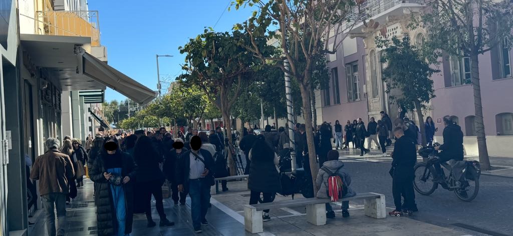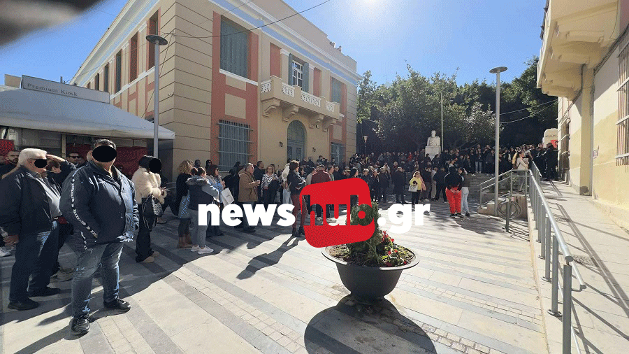 Πλήθος κόσμου έχει συγκεντρωθεί στο κέντρο του Ηρακλείου, έξω από το Δικαστικό Μέγαρο.