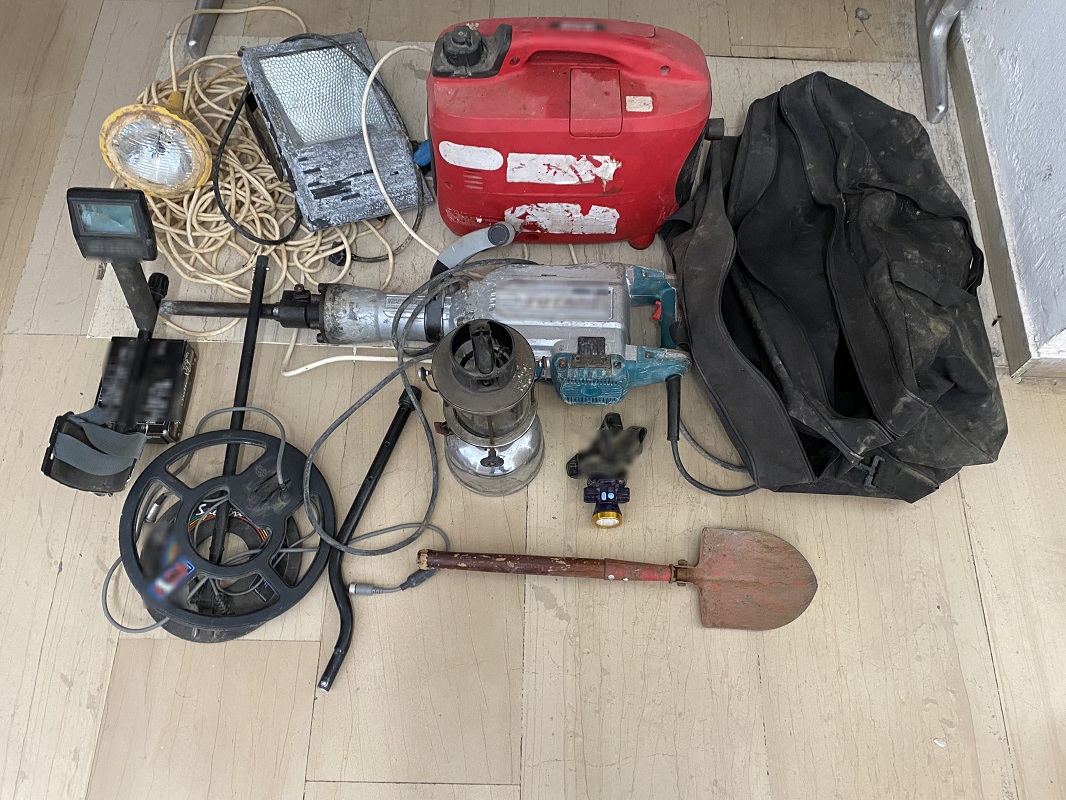 • εργαλεία για την ανασκαφή (ηλεκτρικό κομπρεσέρ, ηλεκτρική γεννήτρια, καλώδιο-μπαλαντέζα με δυο προβολείς, φακός κεφαλής, λουξ φωτισμού, παλάμη)