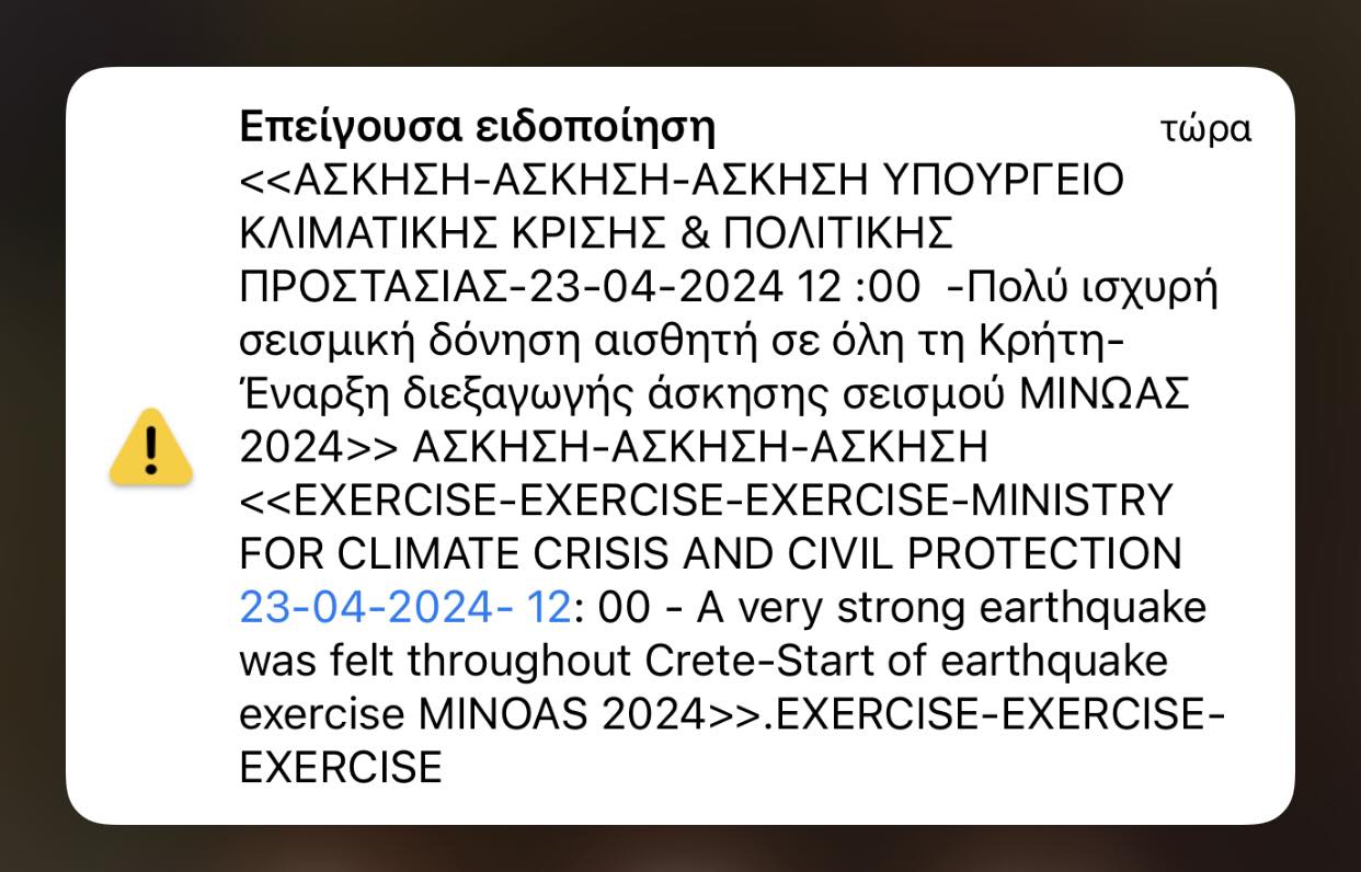 Την Τρίτη 23/4/2024 θα ακολουθήσουν 2 ακόμη μηνύματα από το 112, τα οποία θα αποσταλούν το πρωί σε όλη την Κρήτη. Όλα τα μηνύματα θα ξεκινούν με τη διακριτή ένδειξη «ΑΣΚΗΣΗ – ΑΣΚΗΣΗ – ΑΣΚΗΣΗ», προκειμένου να γίνει αμέσως αντιληπτό ότι πρόκειται για άσκηση και να αποφευχθούν τυχόν παρερμηνείες και αναστάτωση.