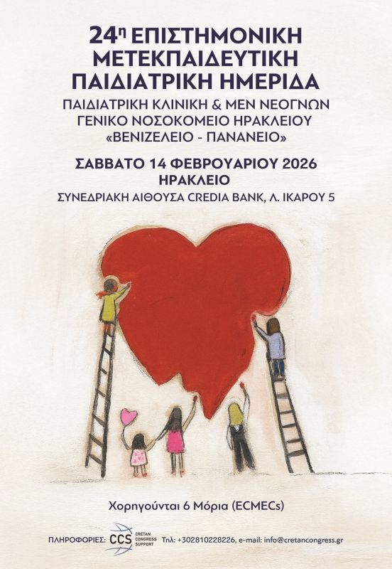 Η Εταιρεία Παιδιάτρων Γενικού Νοσοκομείου Ηρακλείου «Βενιζέλειο – Πανάνειο», διοργανώνει την 24η Επιστημονική Μετεκπαιδευτική Ημερίδα, το Σάββατο 14 Φεβρουαρίου 2026 στη Συνεδριακή Αίθουσα της Credia Bank, Λ. Ικάρου 5.