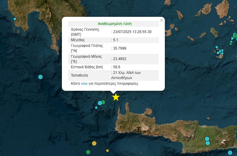 Σεισμός μεγέθους 5,1 Ρίχτερ σημειώθηκε στις 16.26μμ σήμερα Τετάρτη, μεταξύ Κρήτης και Αντικυθήρων