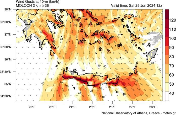 Στον χάρτη που ακολουθεί δίνονται πρόγνωση των ριπών ανέμου στην Κρήτη για τις μεσημεριανές ώρες του Σαββάτου 29/06 ,όπως υπολογίστηκαν από το μετεωρολογικό μοντέλο πολύ υψηλής ανάλυσης του Εθνικού Αστεροσκοπείου Αθηνών/meteo.gr.