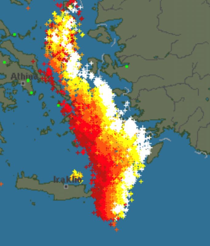 Οι χάρτες που αποτυπώνουν κεραυνούς και αστραπές είναι ενδεικτικοί όσων συνέβησαν στη διάρκεια της νύχτας και μέχρι σήμερα το πρωί οπότε τα φαινόμενα μετακινήθηκαν ανατολικότερα του Ηρακλείου κινούμενα προς Τουρκία.