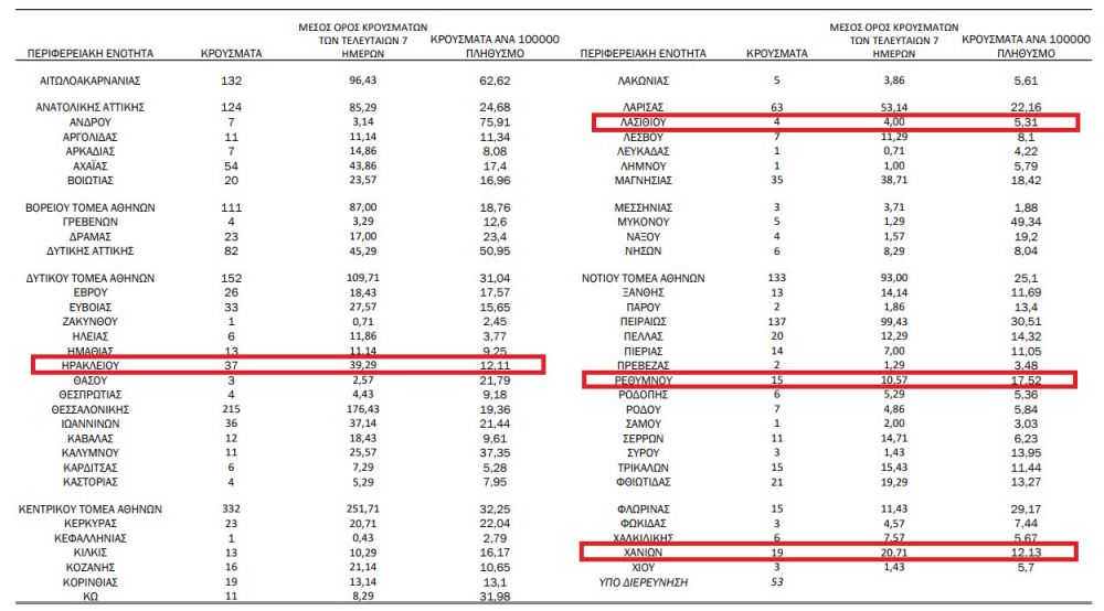 Πιο συγκεκριμένα, στην περιφερειακή ενότητα Ηρακλείου εντοπίστηκαν 37 κρούσματα κορωνοϊού, στα Χανιά 19, στο Ρέθυμνο 15 και στο Λασίθι 4.