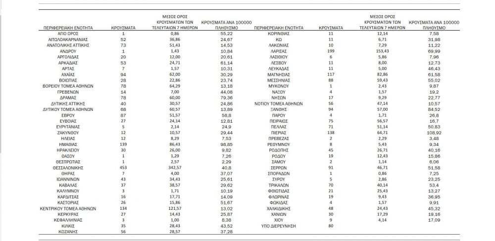 1 Με βάση τα επιβεβαιωμένα κρούσματα των τελευταίων 7 ημερών, 117 θεωρούνται σχετιζόμενα με ταξίδι από το εξωτερικό και 2.102 είναι σχετιζόμενα με ήδη γνωστό κρούσμα.