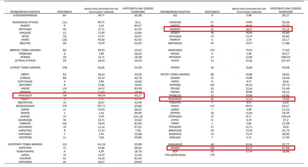 Συγκεκριμένα, η περιφερειακή ενότητα Ηρακλείου κατέγραψε 138 νέα κρούσματα, τα Χανιά 106, το Ρέθυμνο 65 και το Λασίθι 31.