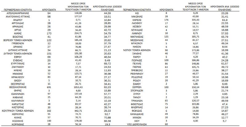 Η γεωγραφική κατανομή των 3869 κρουσμάτων που ανακοίνωσε ο ΕΟΔΥ σήμερα σε ολη την χώρα έχει ως εξής: