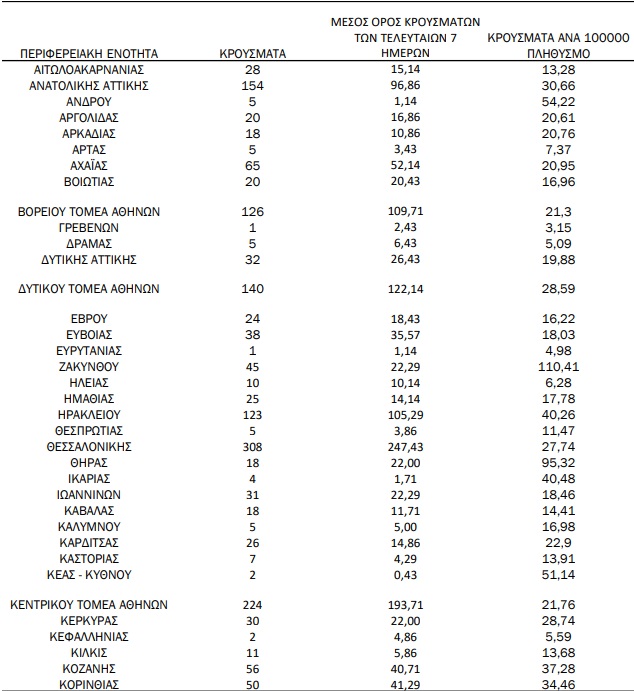 Η γεωγραφική κατανομή των 2874 κρουσμάτων που ανακοίνωσε ο ΕΟΔΥ σε όλη την χώρα έχει ως εξής: