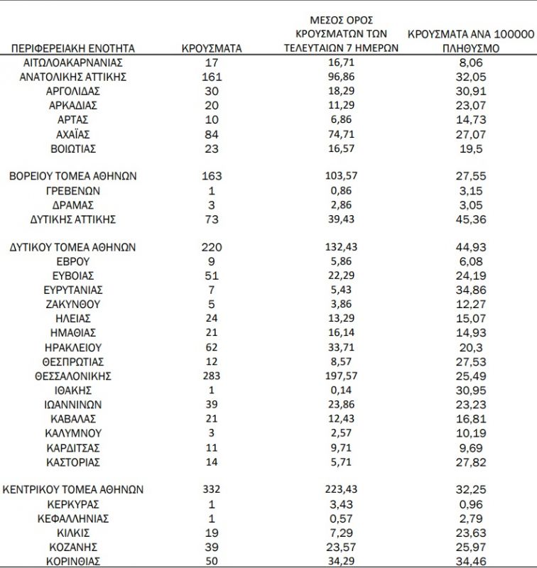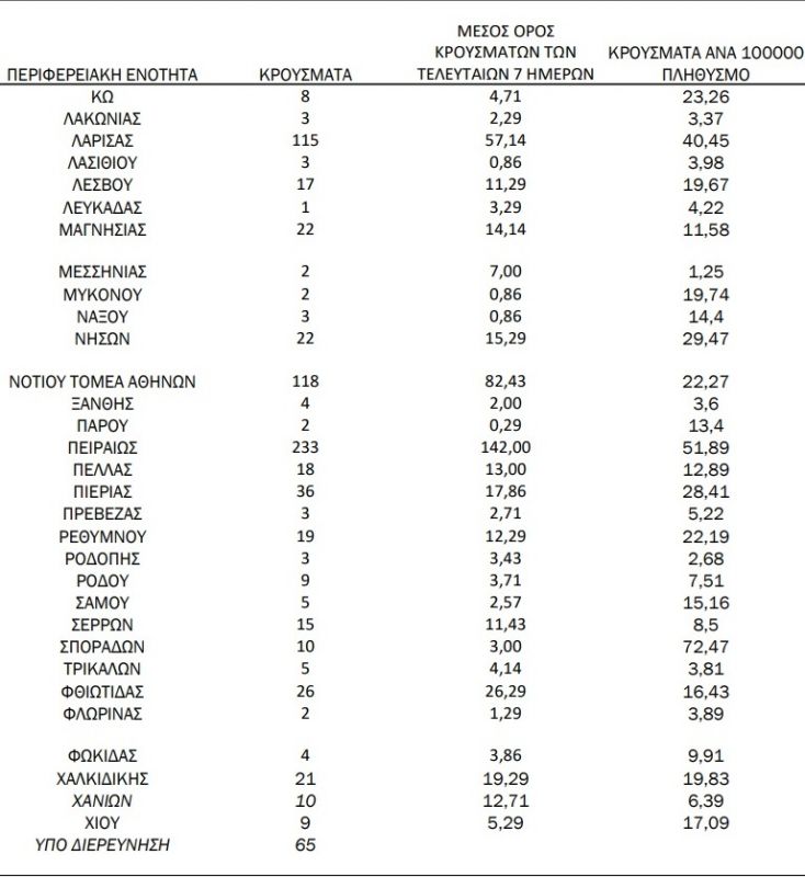 Η γεωγραφική κατανομή των 2633 κρουσμάτων σε όλη την χώρα έχει ως εξής: