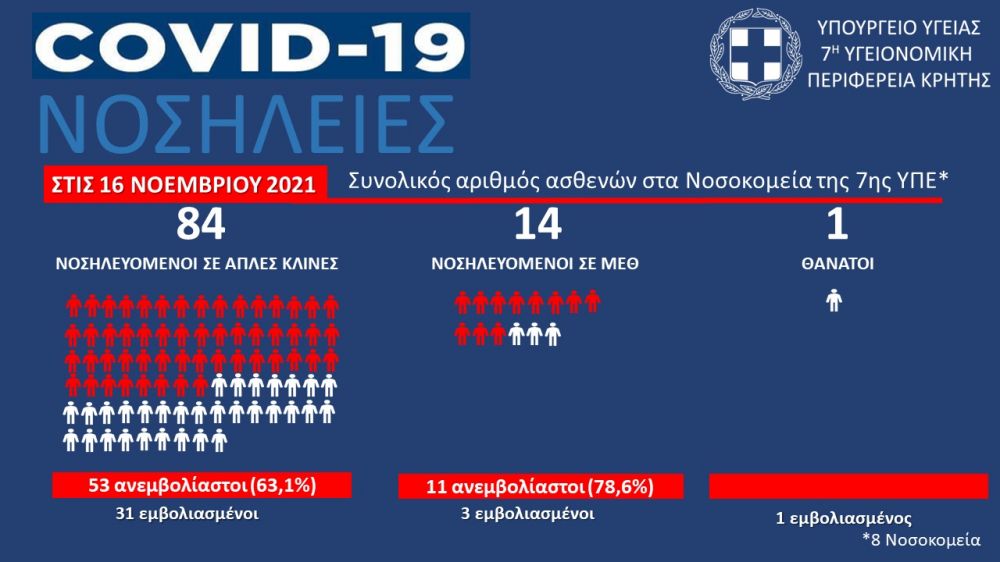 Σύμφωνα με τα στοιχεία που παρουσιάζει η 7Η ΥΠΕ Κρήτης από τους 84 ασθενείς που νοσηλεύονται στα νοσοκομεία μας σε κλινικές κορωνοιού οι 31 είναι εμβολιασμένοι ενώ και απο τους 14 που βρίσκονται σε ΜΕΘ οι 3 ήταν εμβολιασμένοι.