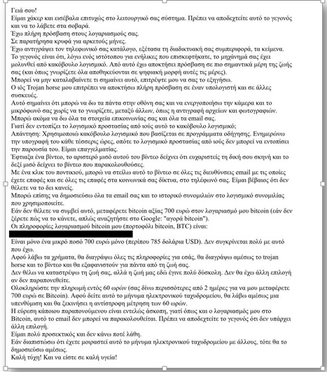 Παράλληλα τους γνωστοποιούν ότι δήθεν έχει εγκατασταθεί κακόβουλο λογισμικό, μετά από την επίσκεψή τους σε κάποιον ιστότοπο, το οποίο έχει ενεργοποιήσει την κάμερα και τους έχει καταγράψει σε προσωπικές στιγμές. Στη συνέχεια αναφέρεται ότι το κακόβουλο λογισμικό έχει συλλέξει όλες τις επαφές των χρηστών από τα μέσα κοινωνικής δικτύωσης και οι δράστες απειλούν με την αποστολή του επίμαχου υλικού στις επαφές τους, σε περίπτωση που δεν λάβουν bitcoins.