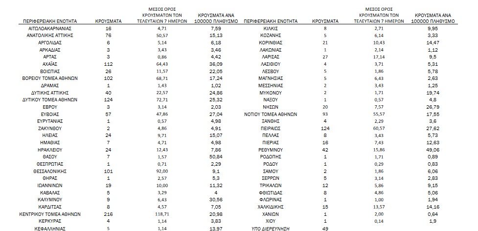Ο χάρτης της γεωγραφικής εξάπλωσης των 1496 κρουσμάτων που ανακοίνωσε σήμερασε ολόκληρη τη χώρα ο ΕΟΔΥ έχει ως εξής: