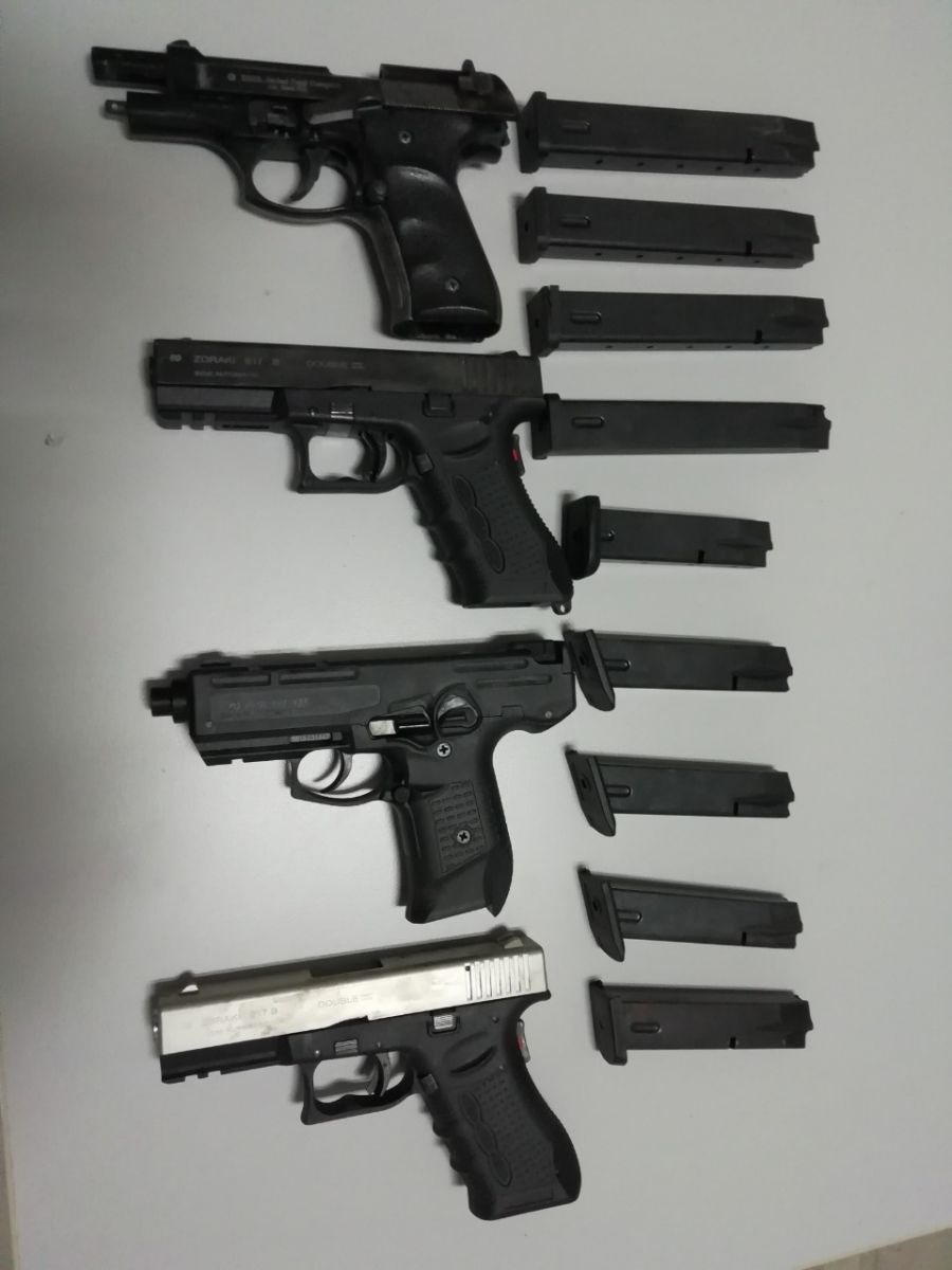 Κατά τη διάρκεια της έρευνας βρέθηκαν και κατασχέθηκαν τέσσερα πιστόλια, οχτώ γεμιστήρες και 215 φυσίγγια.