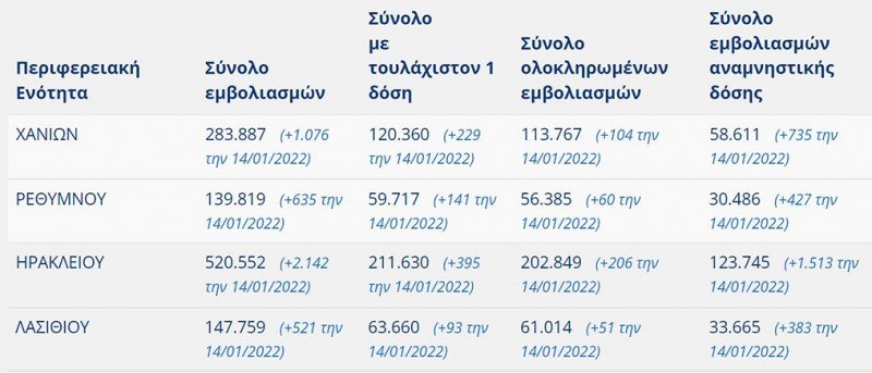 Τα Χανιά είναι στην 15η θέση με 283.887 εμβολιασμούς, το Λασίθι στην 36η θέση με 147.759 και το Ρέθυμνο 39ο με 139.819.