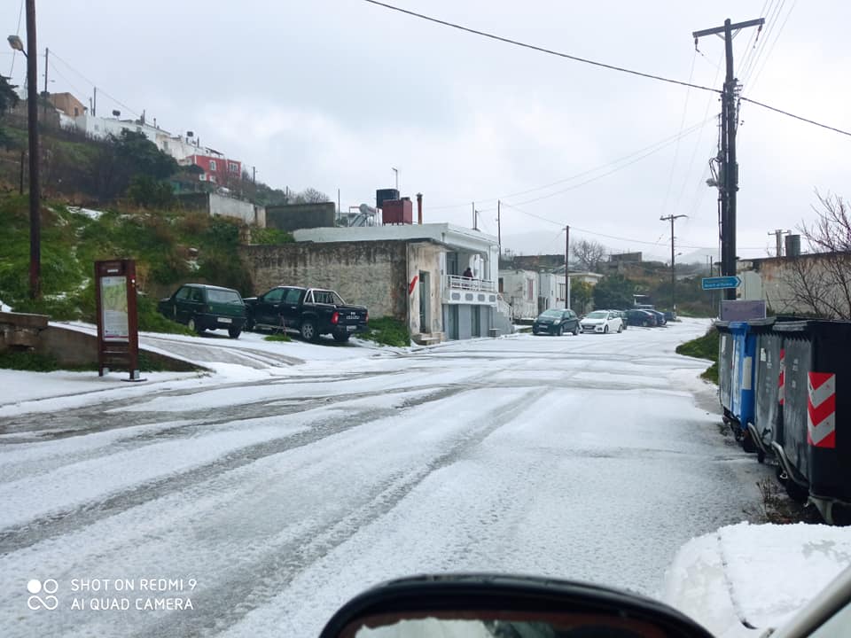 Ειδικά στα ανατολικά του νησιού το χαλάζι ήταν τόσο πολύ κατά τις απογευματινές ώρες που το έστρωσε, όπως μαρτυρούν οι φωτογραφίες από τα Έξω Μουλιανά.