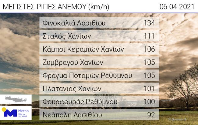Πιο συγκεκριμένα το δίκτυο των αυτόματων μετεωρολογικών σταθμών του Εθνικού Αστεροσκοπείου Αθηνών / meteo.gr στην Κρήτη κατέγραψε τις ισχυρότερες ριπές ανέμου έως το πρωί σήμερα στη Φινοκαλιά Λασιθίου (134 χλμ/ώρα) και στο Σταλό Χανίων (111 χλμ/ώρα).