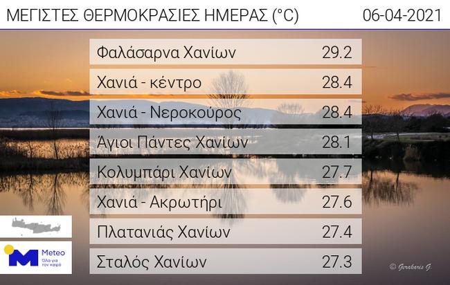 Οι νοτιάδες ανεβάζουν κατά μερικούς βαθμούς τη θερμοκρασία κυρίως στα ορεινά της Κρήτης. Χαρακτηριστική είναι η άνοδος της θερμοκρασίας στις βόρειες περιοχές της Κρήτης. Όπως προκύπτει από τον πίνακα που παρουσιάζει τις υψηλότερες θερμοκρασίες στο νησί έως το πρωί της Τρίτης 06/04, η υψηλότερη σημειώθηκε στα Φαλάσαρνα Χανίων όπου έφτασε τους 29.2 βαθμούς Κελσίου.
