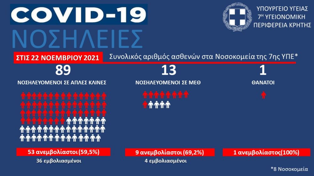 Σύμφωνα με τα σημερινά στοιχεία της 7ης ΥΠΕ Κρήτης οι νοσηλείες κορωνοιού στα νοσοκομεία του νησιού ανήλθαν σε 102 εκ των οποίων 89 ασθενείς νοσηλεύονται σε κλινικές covid με τους 36 εξ αυτών να είναι εμβολιασμένοι. Στις ΜΕΘ νοσηλεύονται 13 άτομα κι από αυτά τα 4 είναι εμβολιασμένα ενώ είχαμε κι ένα θάνατο από επιπλοκές του κορωνοιού σε ασθενή μη εμβολιασμένο