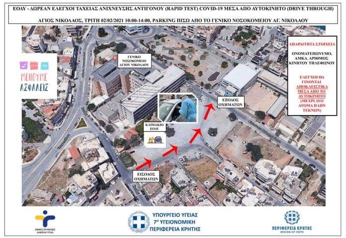 Έλεγχοι ταχείας ανίχνευσης αντιγόνου Covid-19 (rapid test) μέσα από αυτοκίνητο (drive through) θα πραγματοποιηθούν την Τρίτη 02/02/2021 από κλιμάκια του ΕΟΔΥ στον Άγιο Νικόλαο.