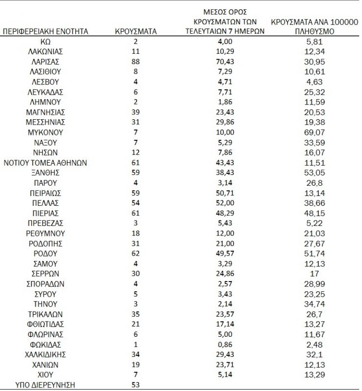 Ειδικότερα, στο Ηράκλειο καταγράφηκαν 52 κρούσματα, στα Χανιά 19, στο Ρέθυμνο 18 και στο Λασίθι 8.