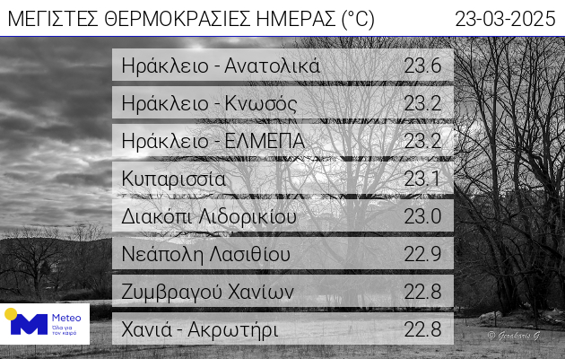 Συγκεκριμένα και σύμφωνα με το meteo.gr, σε περιοχές του Ηρακλείου(όπως ανατολικά προάστει, σε Κνωσό και ΕΛΜΕΠΑ), ο υδράργυρος έφθασε και ξεπέρασε τους 23 βαθμούς Κελσίου, ενώ αντίστοιχα υψηλές θερμοκρασίες καταγράφηκαν σε Νεάπολη Λασιθίου κα Χανιά .
