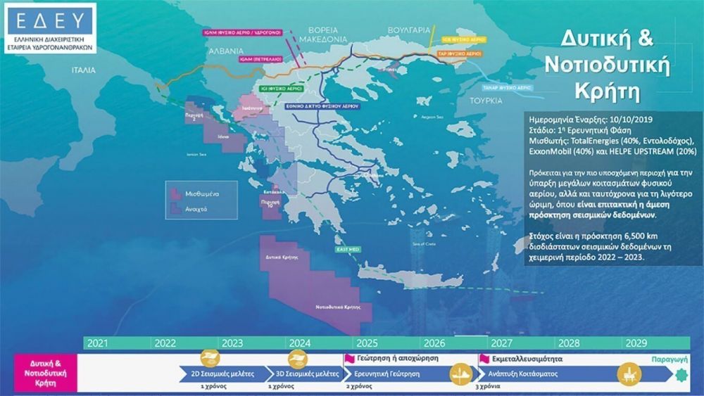 Ετσι, μετά την αποχώρηση της γαλλικής TotalEnergies από τα δύο θαλάσσια blocks της Κρήτης, τα ανέλαβαν η αμερικανική ExxonMobil με την HELLENiQ ENERGY (πρώην ΕΛ.ΠΕ., με τον αμερικανικό κολοσσό να διαθέτει το 75% των δικαιωμάτων έρευνας και τον ελληνικό όμιλο το υπόλοιπο 25%), με την τελευταία να έχει αναλάβει τις σεισμικές έρευνες στα θαλάσσια «block 10» και «Ιόνιο». Την παραχώρηση στο «block 2» και το χερσαίο οικόπεδο «Ιωάννινα», μετά την αποχώρηση της ισπανικής Repsol, ανέλαβε η Energean και την εξαγορά της Edison.