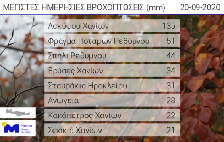 Τα 8 μεγαλύτερα ύψη βροχής στην Κρήτη δίνονται στο πίνακα που ακολουθεί: