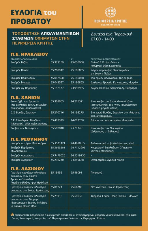 Οι 16 απολυμαντικοί σταθμοί κατανέμονται ως εξής: πέντε (5) στην Π.Ε. Ηρακλείου, τέσ-σερις (4) στην Π.Ε. Χανίων, τέσσερις (4) στην Π.Ε. Ρεθύμνου και τρεις (3) στην Π.Ε. Λα-σιθίου.
