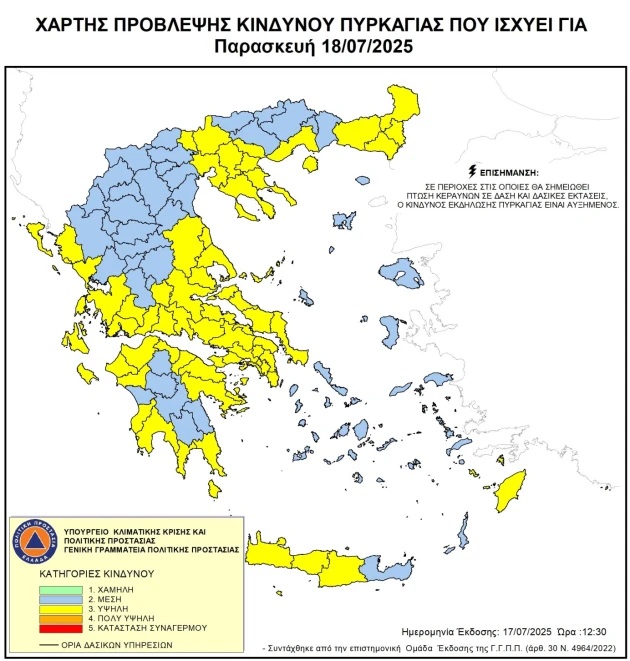 Αρκετές είναι οι περιοχές με υψηλή επικινδυνότητα (επίπεδο 3 – κίτρινο χρώμα) σύμφωνα με τον Χάρτη Πρόβλεψης Κινδύνου Πυρκαγιάς που εξέδωσε η Γενική Γραμματεία Πολιτικής Προστασίας, για σήμερα Παρασκευή 18 Ιουλίου.