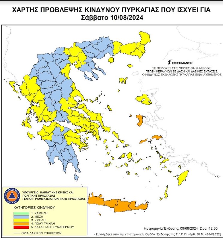 Με ανακοίνωση της η Πολιτική Προστασία Περιφέρειας Κρήτης ενημερώνει ότι, σύμφωνα με τον ημερήσιο Χάρτη Πρόβλεψης Κινδύνου Πυρκαγιάς της Γενικής Γραμματείας Πολιτικής Προστασίας για αύριο Σάββατο 10η Αυγούστου 2024 η κατηγορία Κινδύνου Πυρκαγιάς για όλη την Κρήτη, είναι κατηγορίας κινδύνου 4 (πολύ υψηλός).