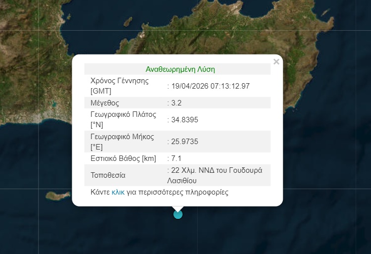 Το εστιακό βάθος της δόνησης εντοπίζεται στα 7.1 χιλιόμετρα.
