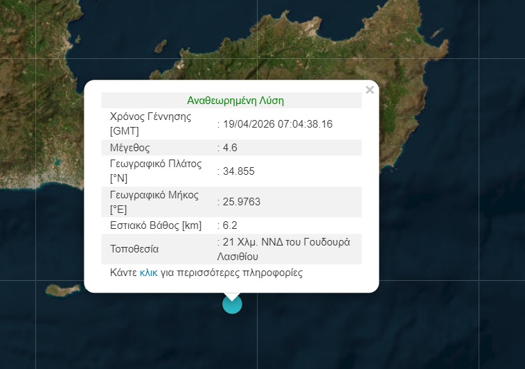 H δεύτερη σεισμική δόνηση καταγράφηκε στο ίδιο σημείο, 22 χιλιόμετρα νότια – νοτιοδυτικά του Γούδουρα Λασιθίου.