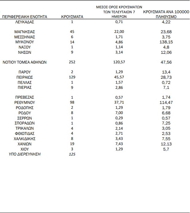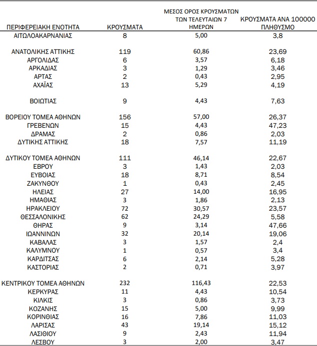 Πρώτο το Ρέθυμνο με 98 κρούσματα, περισσότερα από κάθε άλλη περιφερειακή ενότητα της χώρας εκτός της Αττικής. Ακολουθεί το Ηράκλειο με 72 κρούσματα καιι αυτό πάνω από τη Θεσσαλονίκη σε κρούσματα. Στα Χανιά καταγράφηκαν 19 κρούσματα και στο Λασίθι 9.