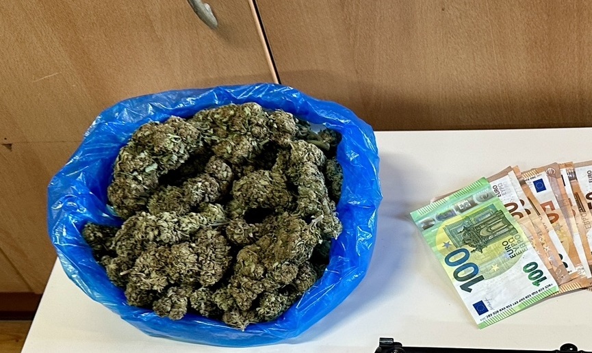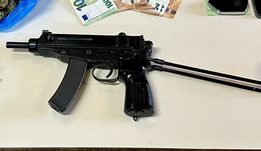 Στο αυτοκίνητο του βρέθηκε και κατασχέθηκε μια συσκευασία η οποία περιείχε 195 γραμμάρια κάνναβης. Αμέσως μετά ακολούθησε έρευνα στο σπιτι του όπου βρέθηκαν και κατασχέθηκαν: ενα υποπολυβόλο με γεμιστήρα, 37 φυσίγγια και το χρηματικό ποσό των 950 ευρώ