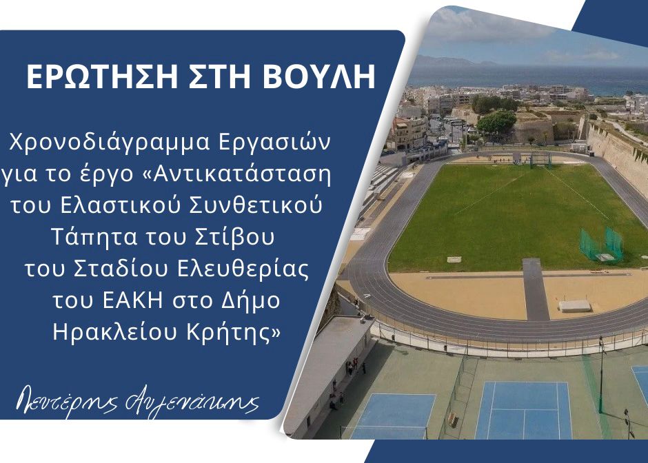 Ο Βουλευτής Ηρακλείου και πρώην Υπουργός Λευτέρης Αυγενάκης κατέθεσε Ερώτηση στη Βουλή προς τον Υπουργό Παιδείας, Θρησκευμάτων και Αθλητισμού, Κυριάκο Πιερρακάκη, αναζητώντας το Χρονοδιάγραμμα Εργασιών για το έργο «Αντικατάσταση του Ελαστικού Συνθετικού Τάπητα του Στίβου του Σταδίου Ελευθερίας του ΕΑΚΗ στο Δήμο Ηρακλείου Κρήτης», του οποίου την αρμοδιότητα έχει ο Αναπληρωτής Υπουργός για θέματα Αθλητισμού, Ιωάννης Βρούτσης