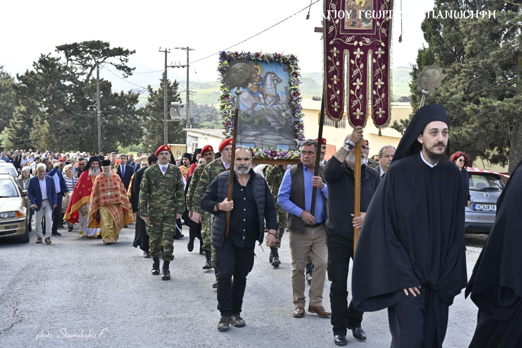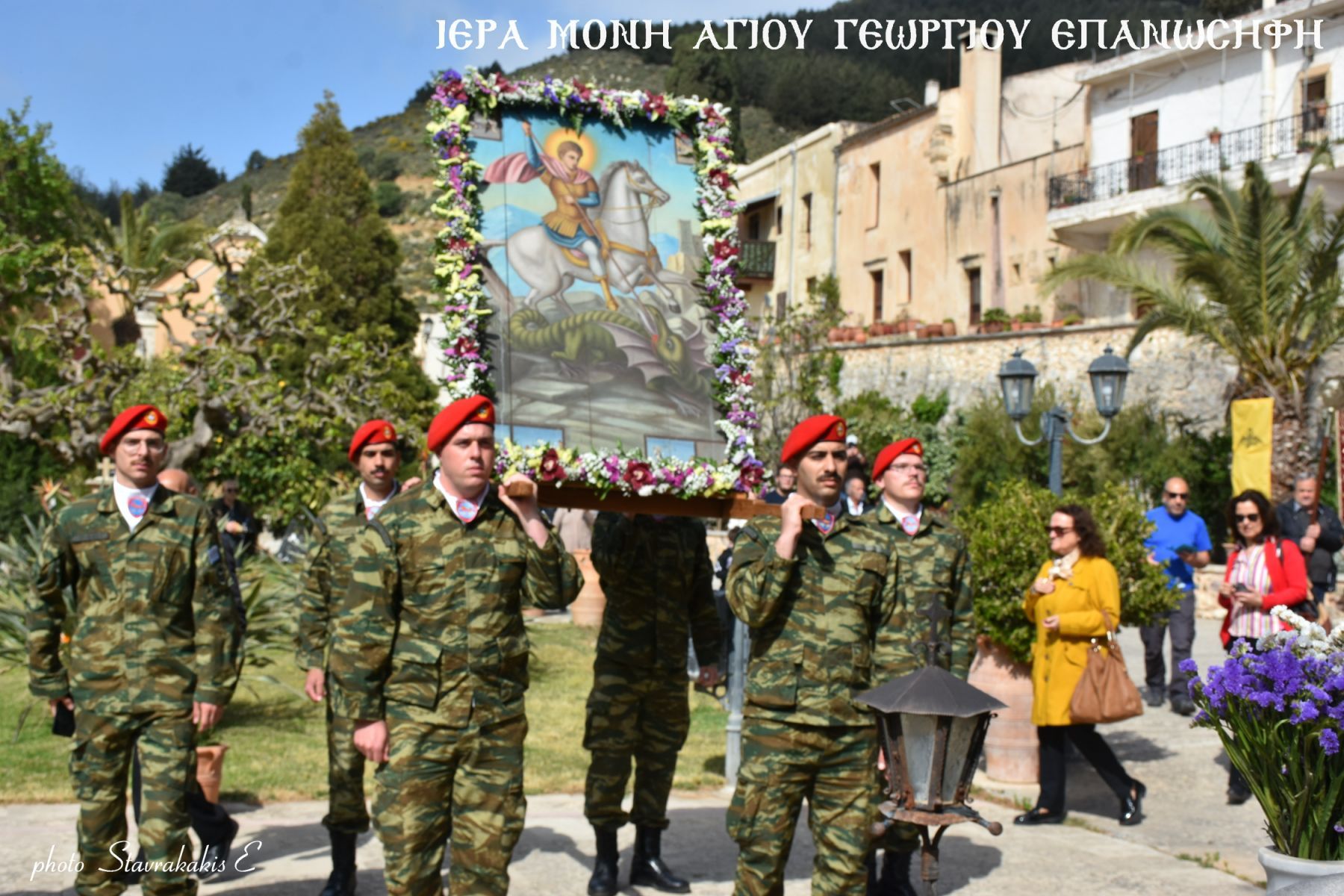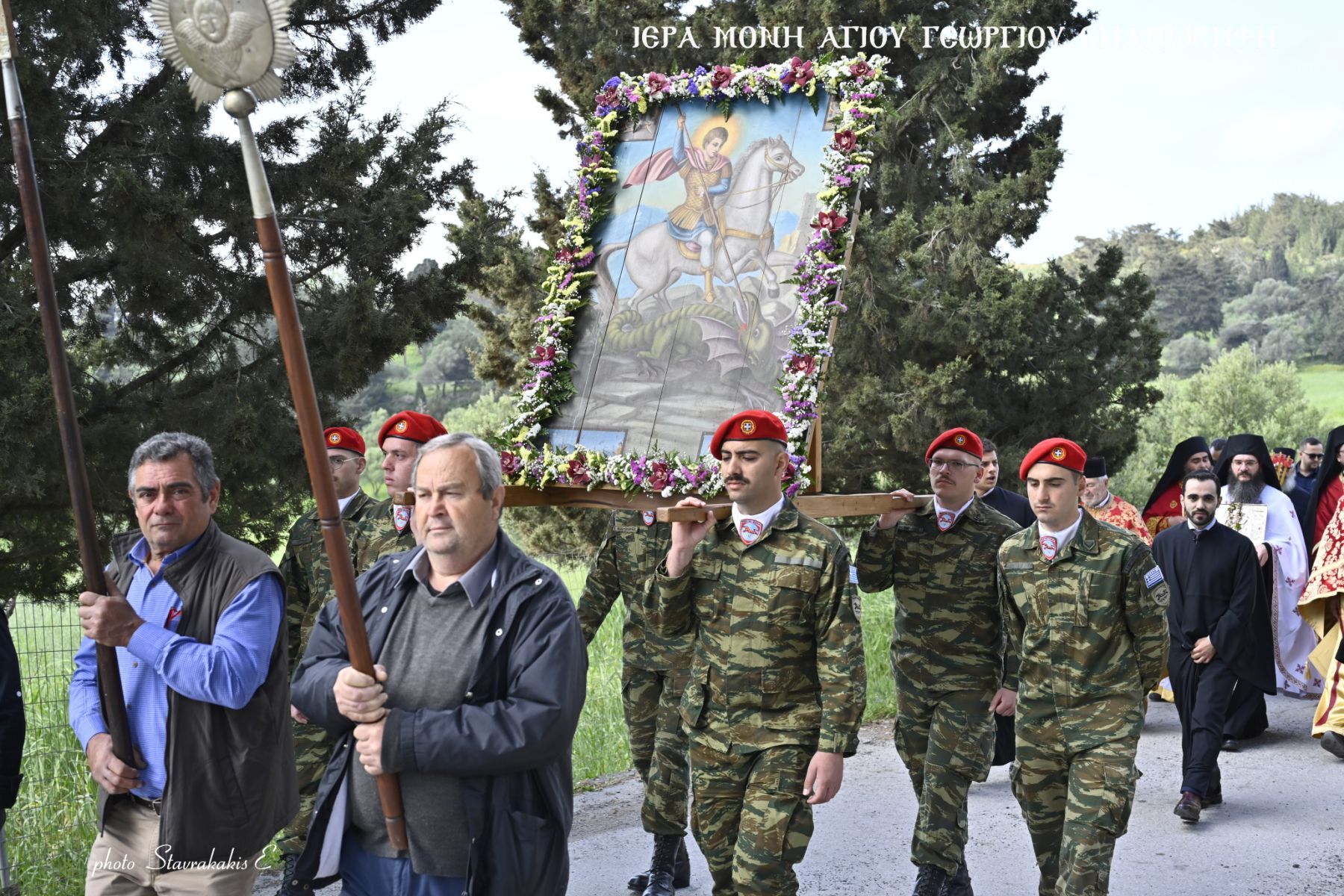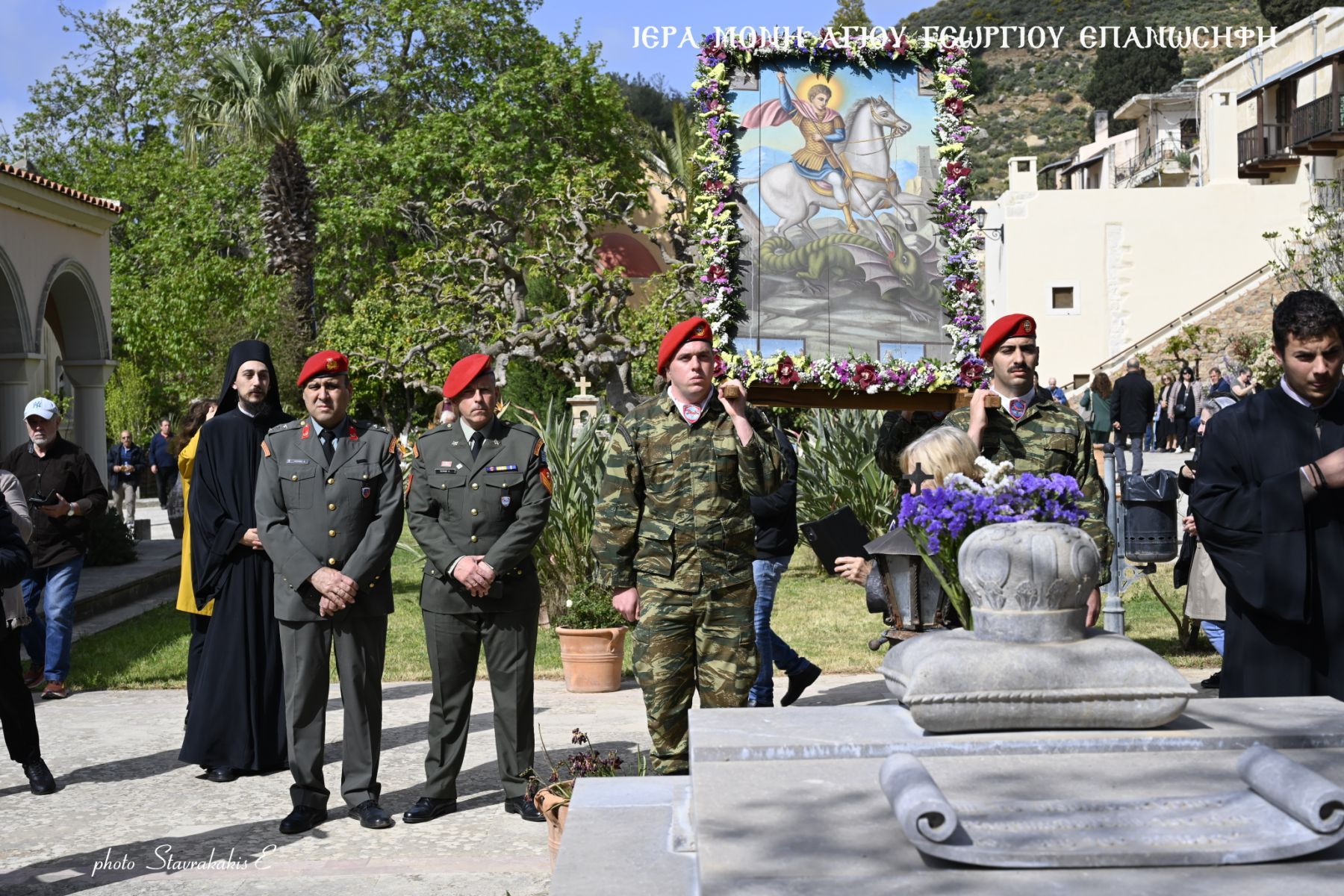 Όπως κάθε χρόνο πραγματοποιήθηκε περιφορά της σεπτής εικόνας του Αγίου γύρω από την Μονή με τη συνδρομή αγήματος του Στρατού και συνοδεία γεωργαλίδικων αλόγων.