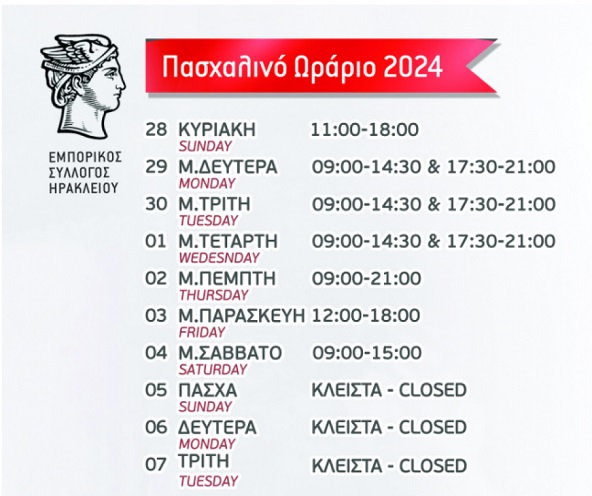 Υπενθυμίζεται ότι το ωράριο λειτουργίας των εμπορικών καταστημάτων όπως ανακοινώθηκε από τον Εμπορικό Σύλλογο Ηρακλείου είναι το παρακάτω: