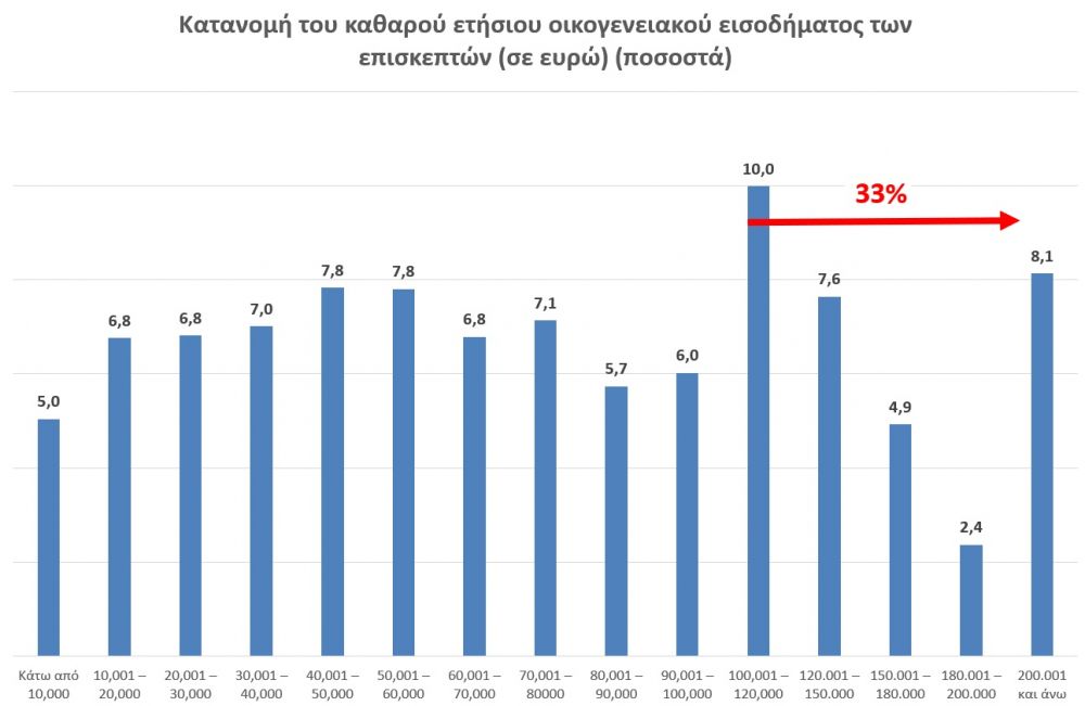 Ο μέσος όρος του εισοδηματικού επιπέδου των επισκεπτών κυμαίνεται μεταξύ της κλίμακας 70.000 - 80.000 ευρώ όταν το 2019 κυμαινόταν σε χαμηλότερα επίπεδα μεταξύ 45.000 - 60.000 ευρώ. Αυτή η αύξηση που παρατηρήθηκε και στην περυσινή περίοδο οφείλεται κυρίως από τουρίστες του Ηνωμένου Βασιλείου και Γερμανίας, αλλά και από την ιδιαίτερη αύξηση αλλοδαπών τουριστών που προέρχονται από χώρες της Αμερικής, Καναδά και Αυστραλίας, οι οποίοι είναι και πολύ υψηλού εισοδηματικού προφίλ. Αξιοσημείωτο είναι το γεγονός ότι το 1/3 των επισκεπτών στην περιοχή μας δηλώνει εισόδημα πάνω από 100.000 €.