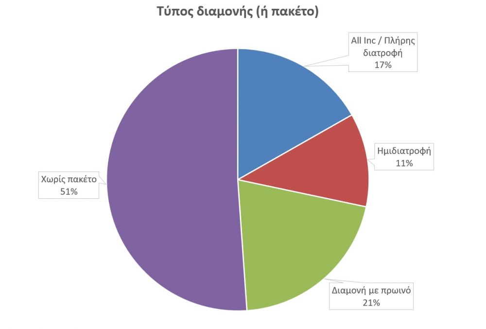 Σταθεροποίηση προτιμήσεων παρατηρούμε στον τύπο καταλύματος αλλά και στα πακέτα διαμονής που προτιμούν οι αλλοδαποί τουρίστες. Πιο συγκεκριμένα, υπάρχει σταθεροποίηση στα ποσοστά των τουριστών που προτιμούν το λεγόμενο πακέτο “all inclusive” αρκετά κάτω του 20%, με τους περισσότερους αλλοδαπούς επισκέπτες να μην προτιμάει κανένα πακέτο. Καθοριστικός παράγοντας για την επιλογή του “all Inclusive” παραμένει η συνοδεία παιδιών κάτω των 15 ετών και η προσέλευση οργανωμένων ομάδων επισκεπτών.