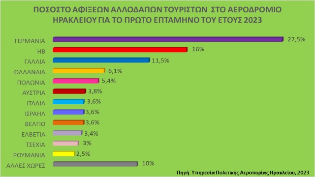 Αναφορικά με τις αφίξεις αλλοδαπών τουριστών στο αεροδρόμιο Ηρακλείου και με βάση τα πρόσφατα στοιχεία της Υπηρεσίας Πολιτικής Αεροπορίας Ηρακλείου, για την περίοδο Ιανουάριος-Ιούλιος 2023, καταγράφεται επίσης ρεκόρ αφίξεων, της τάξεως των 1,9 εκατ. αφίξεων, σημειώνοντας αύξηση κατά 6,5% σε σχέση με τις αφίξεις της αντίστοιχης περυσινής περιόδου που είχαν φτάσει τα 1,8 εκ. αφίξεις, οι οποίες ήταν και οι υψηλότερες αφίξεις έως τότε.