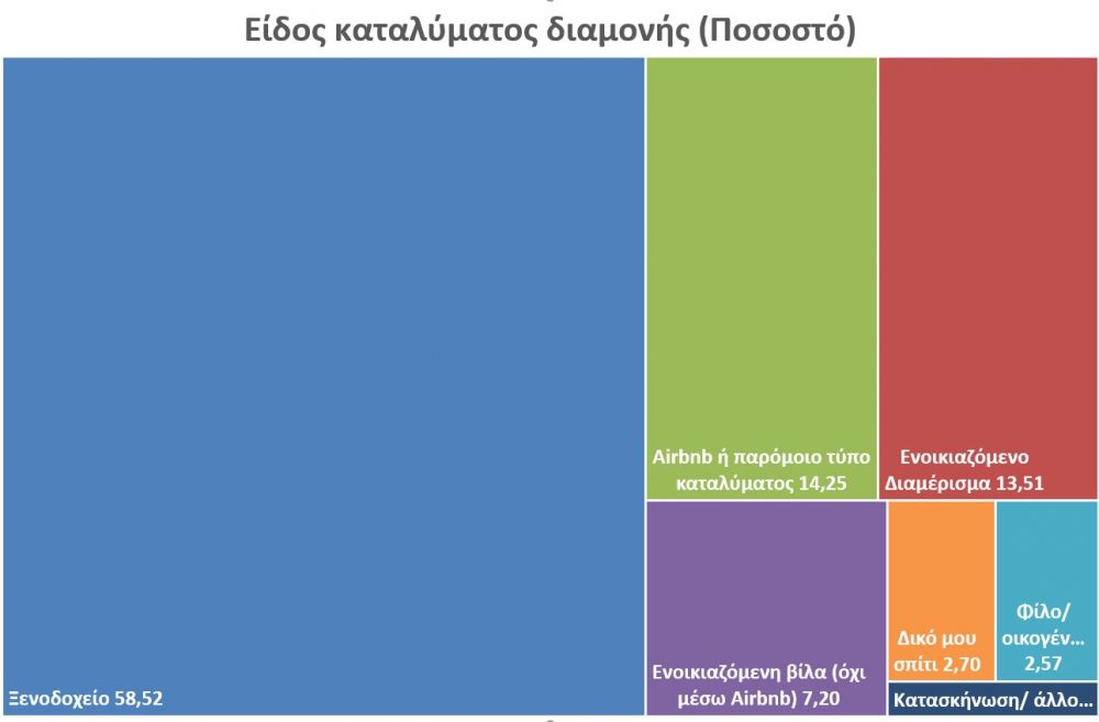 Μεγάλο και φέτος είναι το ποσοστό των αλλοδαπών τουριστών που προτιμούν τις βραχυπρόθεσμες ενοικιάσεις τύπου AirBnB, αφού περίπου το 15% των επισκεπτών επιλέγει να διαμένει σε τέτοια καταλύματα. Τα ξενοδοχεία, παραμένουν στην πρώτη θέση των προτιμήσεων των τουριστών, με πάνω από τους μισούς από αυτούς να τα επιλέγουν, ενώ σχεδόν δύο στους τρεις τουρίστες προτιμούν πολυτελή ξενοδοχεία 4 & 5 αστέρων. Οι βίλες μετά τον διπλασιασμό προσφοράς που παρατηρήθηκε στην περίοδο 2019-21 έχουν φτάσει σταθερά το ποσοστό τους πάνω από 7%. Ο μέσος όρος διανυκτέρευσης στα τουριστικά καταλύματα και φέτος κινείται πάνω από 9 διανυκτερεύσεις.