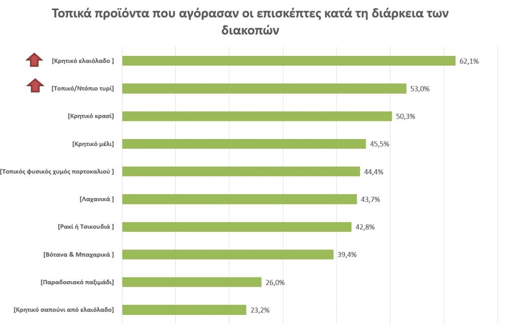 Αναφορικά με τα τοπικά προϊόντα διατροφής, ο αλλοδαπός τουρίστας μένει πολύ ικανοποιημένος από τα ποιοτικά χαρακτηριστικά των προϊόντων αυτών, ενώ φέτος δείχνει να προβαίνει σε μεγαλύτερες από άλλες χρονιές ποσότητες αλλά και ποικιλία προϊόντων. Για πρώτη φορά το ελαιόλαδο μαζί με τα τοπικά τυριά ανεβαίνουν στις δύο πρώτες θέσεις των προτιμήσεων των αλλοδαπών τουριστών με το κρασί να έρχεται στην τρίτη θέση. Ιδιαίτερη δυναμική παρουσιάζουν φέτος το κρητικό μέλι καθώς και ο φυσικός χυμός πορτοκαλιού.