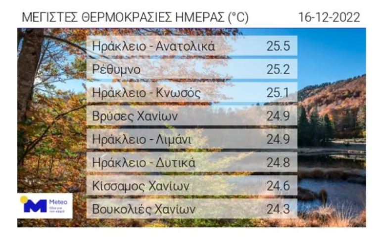 Σύμφωνα με το δίκτυο αυτόματων μετεωρολογικών σταθμών του Εθνικού Αστεροσκοπείου Αθηνών/meteo.gr, υψηλές για την εποχή μέγιστες θερμοκρασίες σημειώθηκαν τις μεσημεριανές ώρες της Παρασκευής 16/12 στη χώρα, με τον υδράργυρο να ξεπερνά τους 25 βαθμούς Κελσίου στην Κρήτη.