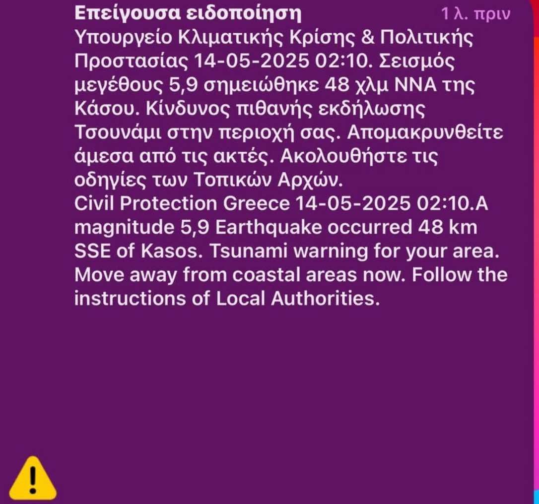Ενώ εστάλη και προειδοποιητικό μήνυμα σε πολίτες από το Υπουργειο Πολιτικής Προστασίας, τους οποίους προειδοποιούσε ακόμη και για την εκδήλωση τσουνάμι.