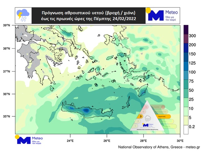Στον Χάρτη 1 παρουσιάζεται ο αθροιστικός υετός (βροχή / χιόνι) που αναμένεται έως τις πρωινές ώρες της Πέμπτης 24/02 στα νότια τμήματα της χώρας όπου αναμένονται τα ισχυρότερa φαινόμενα