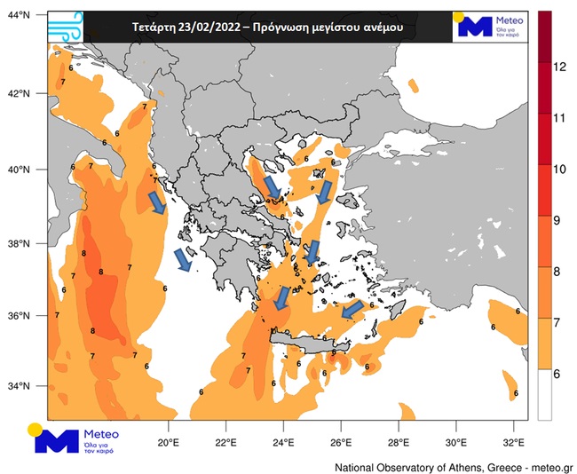 Για το υπόλοιπο της Τετάρτης 23/02, οι βορείων διευθύνσεων άνεμοι στα πελάγη θα παρουσιάσουν μικρή ενίσχυση φτάνοντας κατά τόπους τα 7 μποφόρ ενώ η θερμοκρασία δεν θα ξεπεράσει τους 15-17 βαθμούς στα δυτικά ηπειρωτικά και στις νησιωτικές περιοχές, εξαιρουμένης της Κρήτης και τους 12-14 βαθμούς Κελσίου στα υπόλοιπα ηπειρωτικά και στην Κρήτη.
